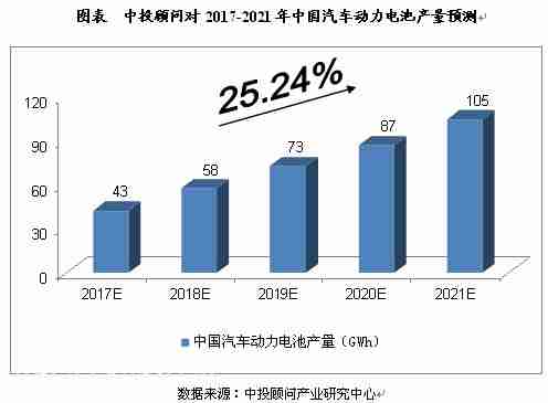 綜合以上因素,我們預(yù)計(jì),2017年我國汽車動(dòng)力電池產(chǎn)量將達(dá)到43GWh,未來五年(2017-2021)年均復(fù)合增長率約為25.24%,2021年將達(dá)到105GWh。